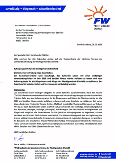 | Antrag der FWG-Fraktion vom 28.06.2022 Die Gemeindevertretung möge beschließen: Der Gemeindevorstand wird beauftragt, das kulturelle Leben mit einer vielfältigen Veranstaltungskultur im Jahr 2023 und darüber hinaus wieder aufleben zu lassen und neue Kulturangebote für die Bürgerinnen und Bürger der Marktgemeinde Eiterfeld zu etablieren. Der Ausschuss für Soziales, Kultur und Vereinswesen soll beteiligt werden. |