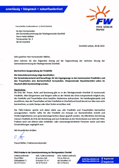 | Antrag der FWG-Fraktion vom 28.06.2022 Die Gemeindevertretung möge beschließen: Der Gemeindevorstand wird beauftragt, für die Zugangswege zu den kommunalen Friedhöfen und den Trauerhallen eine Barrierefreiheit herzustellen. Entsprechende Haushaltsmittel sollen im Haushalt 2023 berücksichtigt werden. |