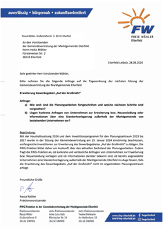 | Anfrage der FWG-Fraktion vom 28.08.2024 Erweiterung Gewerbegebiet "Auf der Großmühl" |