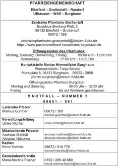| Großentaft | 14:00 Uhr | Requiem für Inge Hohmann anschl. Beisetzung am kirchl. Friedhof |