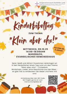 | 14.00 – 18.00 Uhr | Kinderbibeltag „Klein aber oho!“ im Evangelischen Gemeindehaus in Mansbach |