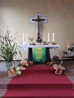 Wie in Fischbach wurde auch der Erntedankgottesdienst in Eiterfeld gefeiert. Hier spielte Katri Carlsen die Orgel. Die Kirche war gut besetzt mit Menschen jeden Alters. Im Gottesdienst, in dem auch das Hl. Abendmahl gefeiert wurde, wirkten drei Konfirmanden und drei Kirchenvorsteher mit. Die Konfirmanden hatten zuvor gemeinsam mit dem Kirchenvorstand den Altar geschmückt. Ihre Erntegaben brachte Pfr. Gruber am Montag zur Hünfelder Tafel, wo sie sehr willkommen waren. Im Anschluss an den Gottesdienst fand ein gemeinsames Kaffeetrinken im Gemeinderaum, wo es einen regen Austausch miteinander gab.