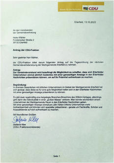 | Antrag der CDU-Fraktion vom 13.10.2023 Der Gemeindevorstand wird beauftragt die Möglichkeit zu schaffen, dass sich Eiterfelder Unternehmen einmal jährlich kostenlos mit einer ganzseitigen Anzeige in den Eiterfelder Nachrichten präsentieren können, um auf ihr Potential aufmerksam zu machen. |