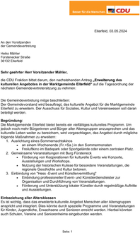 | Antrag der CDU-Fraktion vom 03.05.2024, hier eingegangen am 14.10.2024 Erweiterung des kulturellen Angebots in der Marktgemeinde Eiterfeld |
