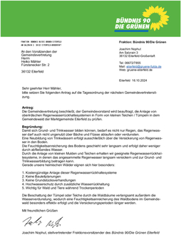 | Antrag der Fraktion BÜNDNIS 90/DIE GRÜNEN vom 16.10.2024 Die Gemeindevertretung beschließt, der Gemeindevorstand wird beauftragt, die Anlage von oberirdischen Regenwasserrückhaltesystemen in Form von kleinen Teichen/Tümpeln in dem Gemeindewald der Marktgemeinde Eiterfeld zu prüfen. |