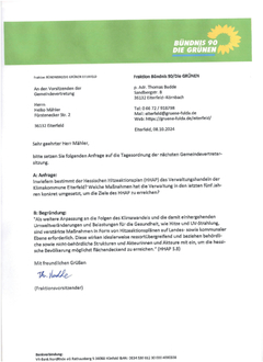 | Anfrage der Fraktion BÜNDNIS 90/DIE GRÜNEN vom 08.10.2024 Inwiefern bestimmt der Hessische Hitzeaktionsplan (HHAP) das Verwaltungshandeln der Klimakommune Eiterfeld? Welche Maßnahmen hat die Verwaltung in den letzten fünf Jahren konkret umgesetzt, um die Ziele des HHAP zu erreichen? |