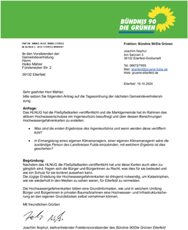 | Anfrage der Fraktion BÜNDNIS 90/DIE GRÜNEN vom 16.10.2024 Das HLNUG hat die Fließpfadkarten veröffentlicht und die Marktgemeinde hat im Rahmen des aktiven Hochwasserschutzes ein Ingenieurbüro beauftragt um über dessen Berechnungen Hochwassergefahrenkarten zu erstellen. Was sind die ersten Ergebnisse des Ingenieurbüros und wann werden diese veröffentlicht? In Ermangelung eines eigenen Klimamanagers, einer eigenen Klimamanagerin wäre die zuständige Person des Landkreises Fulda einzubinden, mit welchem Ergebnis ist dies geschehen? |