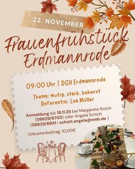 Am Samstag, dem 22.11.2025, findet um 9 Uhr das diesjährige Frauenfrühstück im DGH Erdmannrode statt. Referentin ist die Pfarrerin der Kirchengemeinden Burghaun und Rothenkirchen, Lea-Katharina Müller. Anmeldungen bitte bis zum 18.11.2025 bei Angela Schott (Telefon: 06629/6941, E-Mail: schott.angela@web.de) oder Margarethe Koziol (Telefon: 06629/6703).