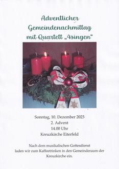 Am 2. Advent laden wir wie in den vergangenen Jahren zu einem Gottesdienst am frühen Nachmittag in die Kreuzkirche ein. Das Quartett „4singen“ gestaltet den Gottesdienst musikalisch mit; in ihm wollen wir möglichst viel singen! Es gibt so schöne Adventslieder! Im Anschluss lädt der Kirchenvorstand zum Kaffeetrinken in den benachbarten Gemeinderaum ein. Wer etwas beisteuern möchte (Kuchen, Plätzchen, Schnittchen), melde sich bitte bei Kirchenvorsteherin Christine Volkenand, Tel. 06672-285.