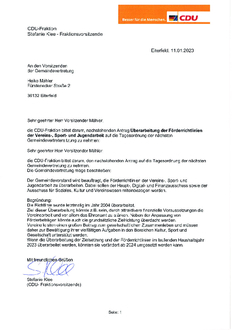 | Antrag der CDU-Fraktion vom 11.01.2023 Der Gemeindevorstand wird beauftragt, die Förderrichtlinien der Vereins-, Sport- und Jugendarbeit zu überarbeiten. Dabei sollen der Haupt-, Finanz- und Digitalausschuss sowie der Ausschuss für Soziales, Kultur und Vereinswesen mit einbezogen werden. |