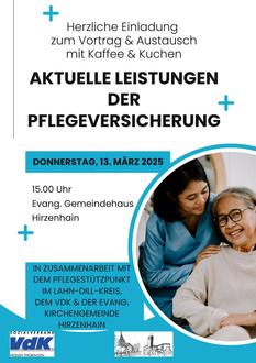 | 15.00 Uhr | Vortrag & Austausch mit und anschließendem Kaffee & Kuchen zum Thema „Aktuelle Leistungen der Pflegeversicherung“ in Zusammenarbeit mit dem VDK, Ev. Gemeindehaus |