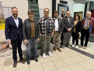 Für die Wiederbewaldung im Hauberg (von links): Geschäftsführer Steffen Bender übergab an Haubergsvorsteher Stefan Schwehn eine Spende zur Wiederbewaldung. Manuel Stößinger, Niklas Müller, Rainer Pliska, Dr. Johannes Rein, Michaela Eckhardt und Vincenz Heiliger wollen als „Stiftung für Eschenburg“ solche Hilfen und Bürger-Initiativen in der Gemeinde vermitteln. (Foto: Götz Konrad)