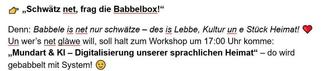 In Südhessen hängt die „Babbelbox“ an Wanderwegen und gibt Hinweise mit dem gesprochenen Wort. Vor dem Festival setzen wir eine „Babbelbox“ ein über ChatGPT. Der Link ist über das „Aktuelle“ und www.eschenburg.de/mundart zu finden. Im Rathaus sind wir uns auch manchmal nicht ganz sicher, mit wieviel „Rrr“ ein Wort richtig gesprochen oder gar geschrieben wird - aber das ist doch kein Grund zum Streiten.