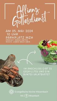 | 10.00 Uhr | Allianz-Gottesdienst mit der FeG, Parkplatz Mehrzweckhalle (Predigt: Dennis Betke, Musik: „Loben nach oben“) Im Anschluss Gegrilltes und buntes Salatbuffet |