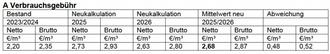 Unter Berücksichtigung dieser Faktoren ergibt sich eine durch das Büro Rösch kostendeckend kalkulierte Verbrauchsgebühr für das Jahr 2025 in Höhe von 2,73 €/m³ Frischwasser und für das Jahr 2026 eine Verbrauchsgebühr in Höhe von 2,63 €/m³ zzgl. der gesetzlichen Umsatzsteuer.