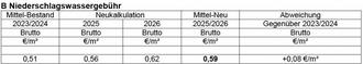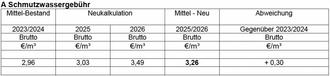 Um nicht in den beiden Kalenderjahren 2025 und 2026 die Gebühren jeweils neu festsetzen zu müssen, schlägt die Betriebsleitung in Verbindung mit dem Rechtsanwaltsbüro Rösch für die Jahre 2025 und 2026 die Bildung eines Mittelwertes vor. Der Mittelwert liegt bei 2,68 € / m³ Frischwasser zzgl. Umsatzsteuer = 2,87 € / m³.