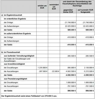Ein Nachtragshaushalt ist aufzustellen, wenn die Aufwendungen eines Budgets um 10 % überschritten werden und die Überschreitung mindestens 50.000 € beträgt. Die Grenze gilt nicht, wenn die Mehraufwendungen durch Mehrerträge, die mit den Mehraufwendungen im direkten Zusammenhang stehen, gedeckt sind. Diese Aufwandspositionen entfallen bei der Berechnung der Budgetüberschreitungen. Das gleiche gilt für Personalaufwendungen, wenn die Personalaufwendungen des gesamten Haushaltes nicht überschritten werden.