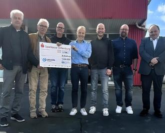Jochen Müller (l.) und Vincenz Heiliger (2.v.l.) überreichen an (v.l.) Lars Lückoff, Dirk Botzon und Benjamin Weyerich den symbolischen Spendenscheck im Beisein von Simon Braun und Jürgen Krüll. (Foto: Conny Holtfoth)