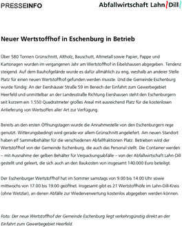 Der Eschenburger Wertstoffhof hat im Sommer samstags von 9.00 bis 14.00 Uhr sowie mittwochs von 17.00 bis 19.00 geöffnet. Insgesamt gibt es 21 Wertstoffhöfe im Lahn-Dill-Kreis (ohne Wetzlar), an denen Abfälle zur Wiederverwertung kostenlos abgegeben werden können.