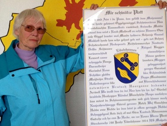 Hermine Schwehn hat vor Jahren ein Mundart-Plakat entworfen (Foto), auf dem eine Sammlung mit Eibelshäuser Begriffen zu finden ist. Das Layout hat sie zunächst einmal mit Stickerei selbst erledigt, bevor die moderne Technik „Mir schwätze Platt“ zur 700-Jahr-Feier von Eibelshausen drucken konnte. Den Rest vom großen Fest hat Hermine Schwehn nun zum MundART-Festival gespendet für die Spenden-Aktion für das Hessen-Nassauische Wörterbuch. Im Rathaus haben wir die Plakate zum Mitnehmen im Foyer. Daneben steht eine Spendenbox.