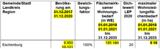 | Daraus ergibt sich ein maximaler Wohnsiedlungsflächenbedarf für das gesamte Gemeindegebiet Eschenburg von 9 ha (gegenüber 10 ha zum ursprünglichen Entwurf). | ||