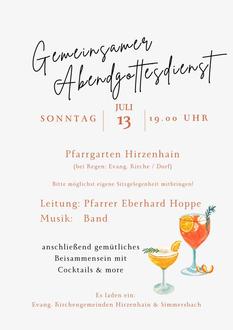 | 19.00 Uhr | Gottesdienst, Ev. Pfarrgarten (mit Pfarrer Eberhard Hoppe) Im Anschluss gemütliches Beisammensein mit Cocktails&more |