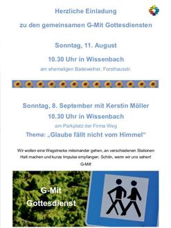 | 10.30 Uhr | Gemeinsamer G-Mit Gottesdienst, Start-/Endpunkt: Alter Wissenbacher Badeweiher (Prädikant Werner Brietzke) |