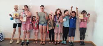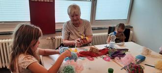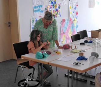 „Häkeln für Fortgeschrittene“ eingeladen. Überrascht von so vielen Anmeldungen, konnten an beiden Tagen 20 Kids betreut werden. Es war für uns eine Herausforderung und auch eine Bereicherung, den Kids unser Wissen weiterzugeben. Mit viel Fantasie und Elan wurden diverse Objekte angefertigt. So entstanden Armbänder, Luftmaschenketten, welche zu kreativen Bildern verarbeitet wurden. Handytaschen, Bücherwürme, Gürteln und vieles mehr. Der große Renner in diesem Jahr waren wieder Bommeln in allen Größen und Farben, welche zu Monstern mit Kulleraugen, Schlüsselanhängern oder dekorativen Blumensträußen verarbeitet wurden. Die erstellten Teile wurden voll Stolz mit nach Hause genommen. Zwischendurch gab es Getränke und Gebäck zur Stärkung. Beim Abschied verteilten wir noch unsere Flyer mit der Einladung, an jedem 2. Mittwoch im Monat unseren Strickkreis zu besuchen. Die schönste Belohnung für uns war die Freude der Kids und die Aussage: im nächsten Jahr kommen wir wieder.