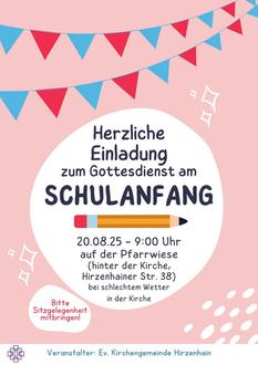 | 09.00 Uhr | Gottesdienst zur Einschulung, Pfarrwiese (bei Regen in der Kirche/Dorf) |