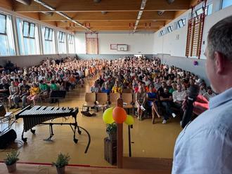 Bei der Begrüßung der neuen Fünftklässler an der Holderbergschule machen die beiden Gemeinden Eschenburg und Dietzhölztal mit, obwohl sie nicht Schulträger sind. Uns ist es aber wichtig, dass beide Kommunen hinter „unserer“ Gesamtschule stehen. Weil Kollege Andreas Thomas jetzt im Urlaub war, hat der Beigeordnete Ingo Panten für Dietzhölztal gesprochen (Foto). Früher ging das jährlich wechselnd über die Bühne, seit einigen Jahren halten wir das Grußwort gemeinsam. Mit mehr als 140 neuen Schülern hat die Holderbergschule einen Zulauf wie lange nicht mehr. Darüber freuen wir uns. Bei dem Programm, bei dem Musikklassen, Bands und die Holderberg-Jongleure mitwirken und - auch für sie ist es der zweite Schultag nach den großen Ferien - dabei wieder beachtliche Leistungen zeigten, wurde mir eines wieder klar: beim Lernen ist es wie bei der Musik: Es kommt aufs Zusammenspiel an.