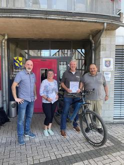 (Ehrung der Teilnehmer*innen mit den meisten geradelten Kilometern - von links: ehrenamtlicher Radverkehrsbeauftragter Benjamin Krüger, Patricia Offenhaus, Markus Neitz, 1. Beigeordneter Jürgen Krüll - Foto: Gemeinde Eschenburg)
