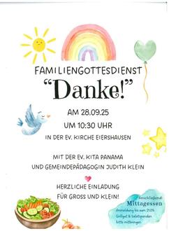 | 10.30 Uhr | Familiengottesdienst, Ev. Kirche (mit Gemeindepädagogin Judith Klein und der Ev. Kita Panama) Im Anschluss gemeinsames Mittagessen. Anmeldung bitte bis zum 21.09.2025 |