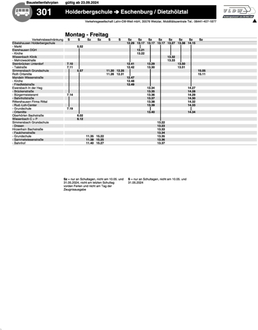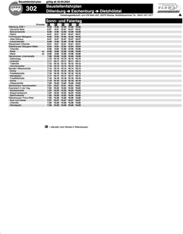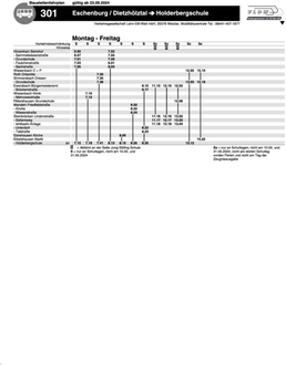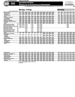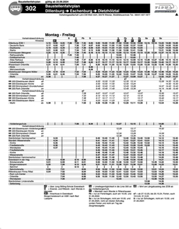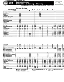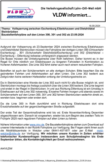 Aufgrund der Vollsperrung ab 23.September 2024 zwischen Eschenburg Eibelshausen und Dietzhölztal Steinbrücken müssen die Fahrpläne der dortigen Linien 300 (Ortsverkehr Eschenburg), 301 (Schulverkehr Dietzhölztal/Eschenburg) und 302 (Dietzhölztal – Eschenburg – Dillenburg) teilweise umfangreich angepasst werden.