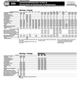 Da in Steinbrücken eine Wende der Linie 302 auch nicht für alle Busse möglich ist, wird Steinbrücken montags bis freitags zusätzlich über die Linien 300 bedient. Die Linie beginnt und endet in der Regel in Steinbrücken. In und aus Richtung Dillenburg ist ein Umstieg in Eibelhausen auf die Linie 302 notwendig. Einzelne Fahrten morgen und abends sowie im Schülerverkehr auf den Linien 300, 301 und 302 fahren Steinbrücken weiterhin direkt an, wenden bzw. beginnen oder enden dort.