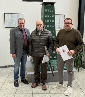 Wechsel in Wissenbach (von links): Bürgermeister Konrad händigt Hans-Joachim Lommler die Entlassungs-Urkunde des Amtsgerichtes und ein Präsent der Gemeinde Eschenburg aus. Burkhard Waldschmidt bekam die Ernennungsurkunde.
