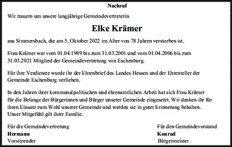 In den Jahren ihrer kommunalpolitischen und ehrenamtlichen Arbeit hat sich Frau Krämer für die Belange der Bürgerinnen und Bürger unserer Gemeinde eingesetzt. Wir danken ihr für ihren Einsatz zum Wohl unserer Gemeinde und werden sie in guter Erinnerung behalten.