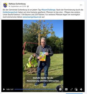 Einmal reicht. Nachdem die Holderbergschule die Gemeinde Eschenburg nominiert hat für die #BaumChallenge, haben wir eine Kastanie gepflanzt, die ohnehin am öffentlichen Spielplatz beim Kindergarten in Hirzenhain/Bahnhof Schatten spenden sollte. „Bei uns ist jeden Tag BaumChallenge“, sagen die Kollegen vom Bauhof. Unsere „Herausforderung“ gilt weit über 1.000 Bäumen auf Grundstücken der Gemeinde. Zur Sicherheit muss die Kommune nämlich „ihre“ Bäume an Straßen, Wegen, Plätzen, in Wohnanlagen, auf Spiel- und Sportanlagen, in Grün-, Freizeit- und Erholungsanlagen, an Kindertagesstätten oder auf Friedhöfen mindestens zweimal jährlich kontrollieren, im belaubten und unbelaubten Zustand. Seit Sommer läuft das digital: 1.103 Einzelbäume und 209 flächige Baumbestände (629.241 m²) sind in einem Kataster erfasst und werden kontrolliert und mit Computer-Hilfe protokolliert. An 83 Einzelbäumen wurden Probleme festgestellt, die zu beseitigen sind, um die Verkehrssicherheit weiterhin zu gewährleisten. Pflanzen ist das eine - Pflegen das andere. Deshalb halten auch unsere Kollegen im Wald, deren Bäume hier noch gar nicht mitgezählt sind, nichts von Symbol-Politik und hätten gerne Geld für größere Anpflanzungen zur rechten Zeit. Wir wollen mit unserem Video deshalb auch nicht andere nominieren, sondern animieren. Womöglich legen wir nochmals unsere Aktion „Bürgerbaum“ (www.buergerbaum.de), bei der 1.000 Bäume an Familien in Eschenburg verteilt werden konnten, auf. Dafür hat es nur von der Sparkasse einen Preis gegeben, aber keine Förderung ist hierfür zu finden. Vielleicht eine Chance, Spender zu finden, die über die „Stiftung für Eschenburg“ Mittel bereit stellen für neue Bäume und Pflanzaktionen. Ideen fürs Pflanzen und Pflegen hat die „Kommission Zukunft“.