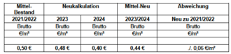 Die Kalkulation ergibt eine Gebühr von 0,48 €/m² für das Jahr 2023 und eine Gebühr von 0,40 €/m² für das Jahr 2024. Der Mittelwert beträgt hier 0,44 pro m² (brutto).