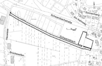 Im Norden ist ein Spielplatz vorhanden. Die dahinter liegenden Grundstücke sind bebaut (Schwarzbachstraße 2).