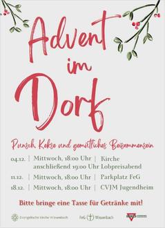 | 09.15 Uhr | Gottesdienst zum 1. Advent, Ev. Kirche (mit Prädikantin Brigitte Schwehn) |