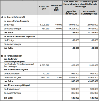 Ein Nachtragshaushalt ist aufzustellen, wenn die Aufwendungen eines Budgets um 5 % überschritten werden und die Überschreitung mindestens 25.000 € beträgt. Die Grenze gilt nicht, wenn die Mehraufwendungen durch Mehrerträge, die mit den Mehraufwendungen im direkten Zusammenhang stehen, gedeckt sind. Diese Aufwandspositionen entfallen bei der Berechnung der Budgetüberschreitungen. Das gleiche gilt für Personalaufwendungen, wenn die Personalaufwendungen des gesamten Haushaltes nicht überschritten werden.