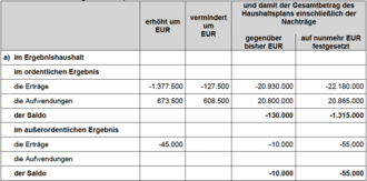 Ein Nachtragshaushalt ist aufzustellen, wenn die Aufwendungen eines Budgets um 5 % überschritten werden und die Überschreitung mindestens 25.000 € beträgt. Die Grenze gilt nicht, wenn die Mehraufwendungen durch Mehrerträge, die mit den Mehraufwendungen im direkten Zusammenhang stehen, gedeckt sind. Diese Aufwandspositionen entfallen bei der Berechnung der Budgetüberschreitungen. Das gleiche gilt für Personalaufwendungen, wenn die Personalaufwendungen des gesamten Haushaltes nicht überschritten werden.