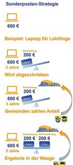 Es wirkt teilweise schizophren, wenn ich als Verbandsvorsteher fürs Freizeitbad Rechnungen an die Bürgermeister der Gemeinden Eschenburg und Dietzhölztal schreibe, aber es ist ja für einen guten Zweck: Die Sonderpostenauflösung sichert das Schwimmbad auch bei kleinen Beträgen. Wie sich das rechnet, erkläre ich heute mal an einem Rechner: Ein Laptop für die Lehrlinge kostet 600 € und wird über drei Jahre abgeschrieben. Als Aufwand liegen jährlich 200 € auf der Waage. Weil aber die 600 € Kosten von den beiden Gemeinden als Zuweisung übernommen werden - 400 € von Eschenburg und 200 € von Dietzhölztal, wird der Aufwand Abschreibung aufwogen von der Auflösung der Sonderposten. Die 600 €, die von den Gemeinden zusammengelegt und zugwiesen wurden, werden auch über drei Jahre aufgelöst und wiegen die Abschreibung damit komplett auf. Zukunft ist eine Frage der Waage.