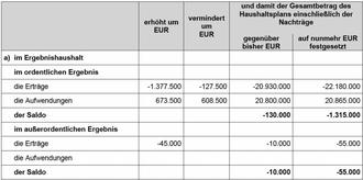 Ein Nachtragshaushalt ist aufzustellen, wenn die Aufwendungen eines Budgets um 5 % überschritten werden und die Überschreitung mindestens 25.000 € beträgt. Die Grenze gilt nicht, wenn die Mehraufwendungen durch Mehrerträge, die mit den Mehraufwendungen im direkten Zusammenhang stehen, gedeckt sind. Diese Aufwandspositionen entfallen bei der Berechnung der Budgetüberschreitungen. Das gleiche gilt für Personalaufwendungen, wenn die Personalaufwendungen des gesamten Haushaltes nicht überschritten werden.
