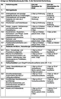 | (3) | Die Zahl der nach Abs. 1 herzustellenden Abstellplätze bemisst sich nach der dieser Satzung beigefügten Anlage, die verbindlicher Bestandteil dieser Satzung ist. Bei der Abstellplatzberechnung ist jeweils ab einem Wert der ersten Dezimalstelle ab fünf auf einen vollen Abstellplatz aufzurunden. |