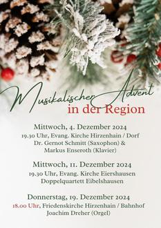 | 19.30 Uhr | 2. Adventsandacht, Musikalischer Advent in der Region, Ev. Kirche Eiershausen (mit Pfr. Michael Brück und dem Doppelquartett Eibelshausen) |