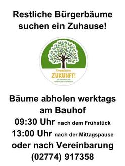Es sind auch noch Bäume übrig, die - solange der Vorrat reicht - am Bauhof abgeholt werden können. Nach dem Frost werktags um 9:30 Uhr und gegen 13 Uhr oder nach telefonischer Vereinbarung (02774 917358) können die Bäume am Bauhof abgeholt werden.