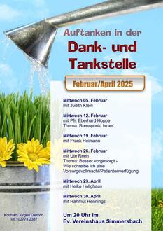 | 20.00 Uhr | Dank- und Tankstelle, Ev. Vereinshaus (mit Judith Klein) |