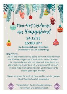 | Krabbelkäfer, Eltern-Kind-Kreis: Wir begrüßen euch gerne zum Heiligabend-Mini-Gottesdienst im Ev. Gemeindehaus in Hirzenhain am 24.12.2023 um 15.00 Uhr |