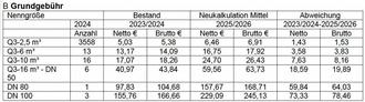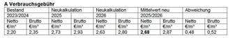 Um nicht in den beiden Kalenderjahren 2025 und 2026 die Gebühren jeweils neu festsetzen zu müssen, wird für die Jahre 2025/2026 ein Mittelwert gebildet. Dieser beträgt 2,68 € / m³ Frischwasser zzgl. Umsatzsteuer = 2,87 € / m³.